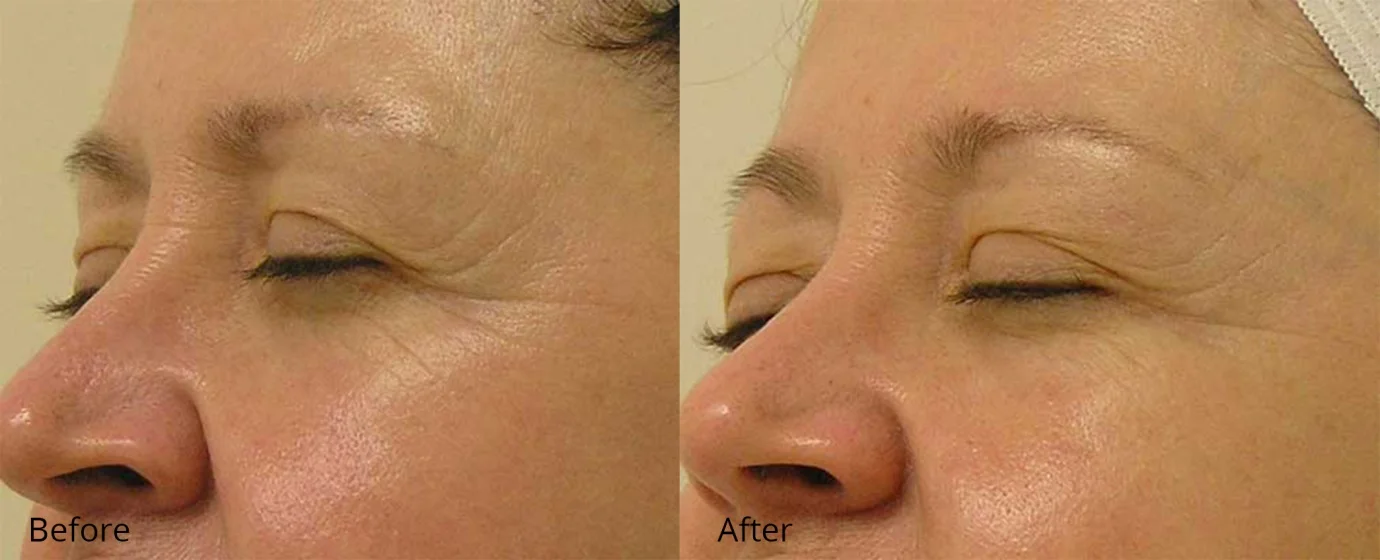 Over the years, the skin loses its elasticity due to our loss of collagen, which makes skin prone to wrinkles and sagging. Hyaluronic acid stimulates collagen, which ensures that skin remains supple and elastic. Here, we see that the client has reduced wrinkles around the eye and less redness around the central areas of her face, leaving her with a healthy glow.
