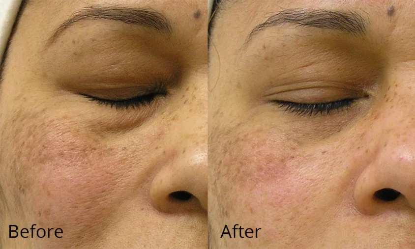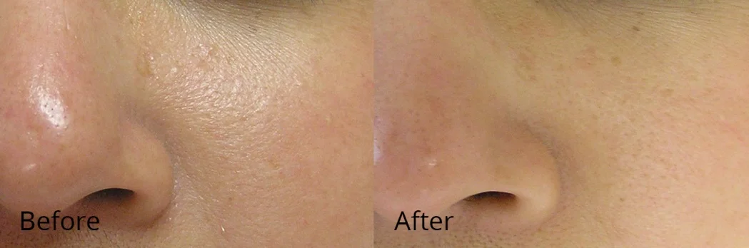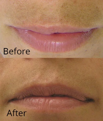 Melasma manifests as dark facial skin areas associated with pregnancy, oral contraception and also those with olive skin. This client demonstrates this skin problem above the lip. After treatment, results show a reduction of skin discoloration, with the area appearing much lighter and less pigmented.
